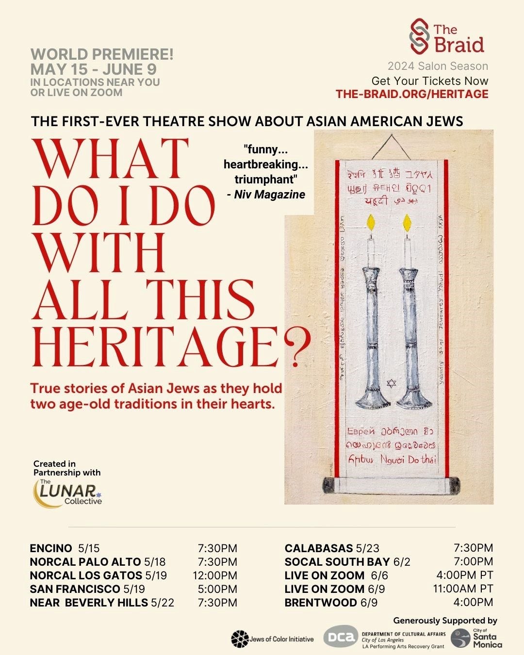 And last in writerly news, I want to announce that a story I wrote is being included in the upcoming production of The Braid (formerly known as the Jewish Women’s Theater). This wonderful group has their home in Santa Monica, and is known for bringing their traveling shows to many parts of California and beyond. The shows are also available on Zoom. I’ve followed this theater group for ten years, first regularly attending their shows in Palo Alto when we lived in Northern California, then helping bring them here to the Santa Ynez Valley. They have a unique format. Each show has a theme. Professional actors read, but also act, the true stories of the theme being produced. There is immediacy and humor and pathos and I’ve never left one of The Braid’s performances without many laughs as well as wiping away a few tears. Past performances have focused on Social Activism, Food, The Holocaust, Immigrants, Health, Grief and Loss. Recent shows have addressed the topic Jews of many colors. I have submitted a few times in the past, but now one of my stories will be in the May-June, 2024 show. This production’s theme is: Asian American Jews, and is done in cooperation with The Lunar Collective, an organization of Asian American Jewish people. (I’ve learned that there are many more than I realized). One of the stories performed will be about my husband David, who is of Chinese ancestry. I wrote about our meeting and his eventual decision to become a Jew by Choice. I hope you’ll be able to attend one of the shows. Although my husband is a very fine looking fellow, he’ll be played by a very handsome Asian American actor. I’ll be at the Los Gatos as well as the Calabasas shows. Come say hello!